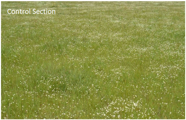 Materials and methods used for this experiment were as follows; The test location consisted of a 60 acre pasture / hay field of rye grass. The field was then separated and marked into 2, 30 acre sections. One 30 acre section was fertilized, the other 30 acre section was not. The fertilizer used in the application was Grasshopper Fertilizer 30-10-10 containing micronutrients (Boron .02, Copper .05, Iron .10, Manganese .05, Molybdenum .001 and Zinc .05). The 30-10-10 blend was used at a rate of 12.5 lbs per acre and combined with Grazon at a rate of 1 pint per acre. The application was made on April 2nd. The grass was approximately 4 inches tall at the time of application.