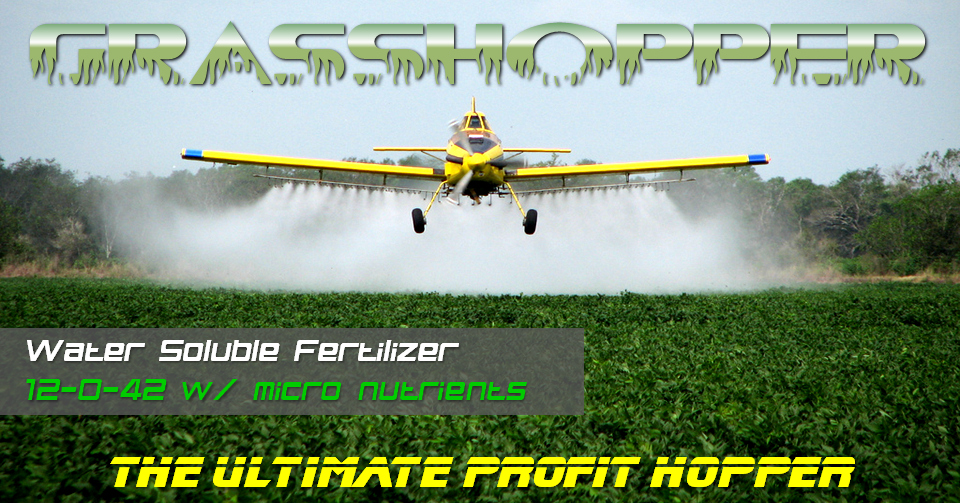Grasshopper 12-0-42 is a proprietary blend of water soluble fertilizers, micro-nutrients and root stimulators. This high Potash formula contains a high availability, stabilized grade of derivatives that will promote increased nodulation and root development while achieving complete absorption within 12 hours. Grasshopper is derived from the highest quality technical and food grade nutrients available. Grasshopper’s proprietary design promotes superior absorption and nutrient translocation within the plant. As a result, activity begins immediately without rain. Grasshopper 12-0-42 is recommended for Row Crops, Hay, Pasture, Vegetable Crops, Fruit and Nut Crops, Ornamentals and Turf. Grasshopper is ideal for pivot and drip irrigation systems, ground and aerial applications. It is compatible with Slow Ride and NuCrop NPK fertilizers and micronutrients and can be tank mixed with most herbicides, insecticides, and fungicides.
